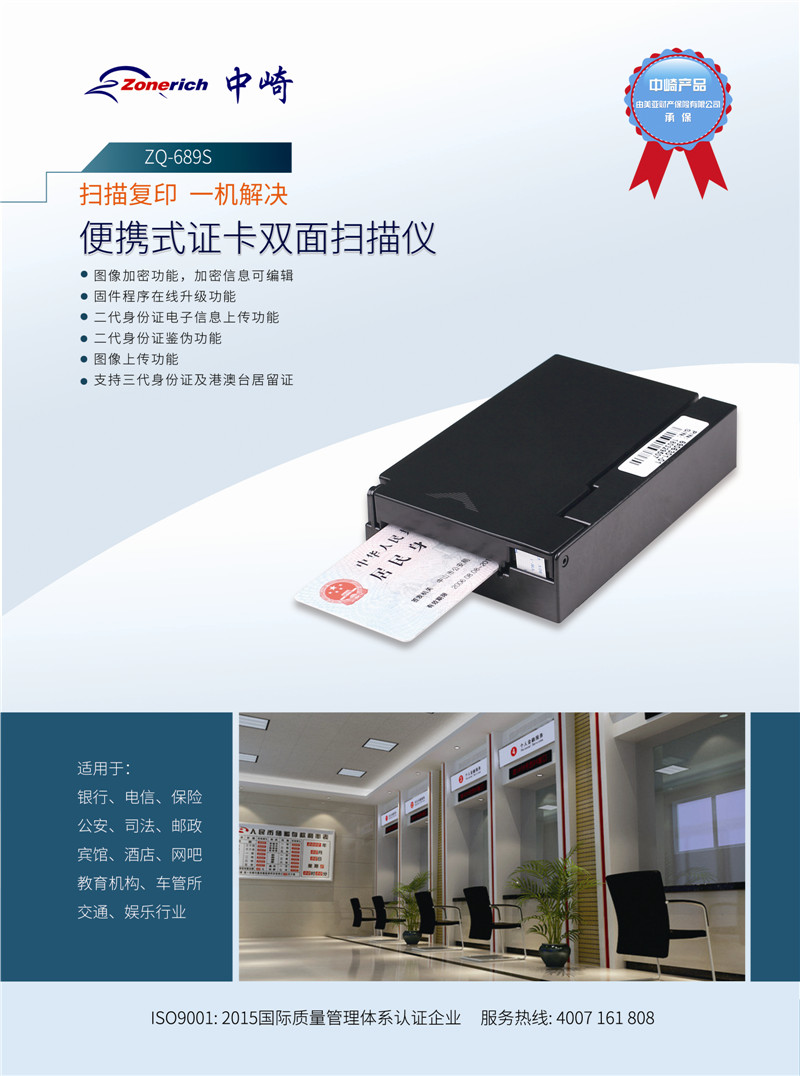身份证双面扫描鉴伪模块是一款具有身份证扫描鉴伪功能的智能化模块。该模块最大扫描宽度为54.8mm,是一款专门用于身份证双面扫描鉴伪的模块。该模块可以单独使用,也可以作为一个嵌入式模块使用。该模块已广泛应用于银行、电信、保险、酒店等涉及到身份证扫描鉴伪业务的各种场合。 身份证双面扫描鉴伪模块可以通过“USB接口”与计算机设备相连接,同时提供Win2000/XP/2003/Vista/2008/Win7/Win8/ Win10操作系统下的驱动程序及基于DLL的软件开发包。 身份证双面扫描鉴伪模块的功能: 单面/双面扫描(可选择) 图像加密功能,加密信息可编辑 固件程序在线升级功能 图像上传功能 二代身份证鉴伪功能 二代身份证电子信息上传功能 前进前出 图像分辨率300dpi 与PC连接后,可控制打印机对扫描后的图像进行打印 身份证两面的图像排布在一张纸上,满足银行等其他领域的复印件存档功能